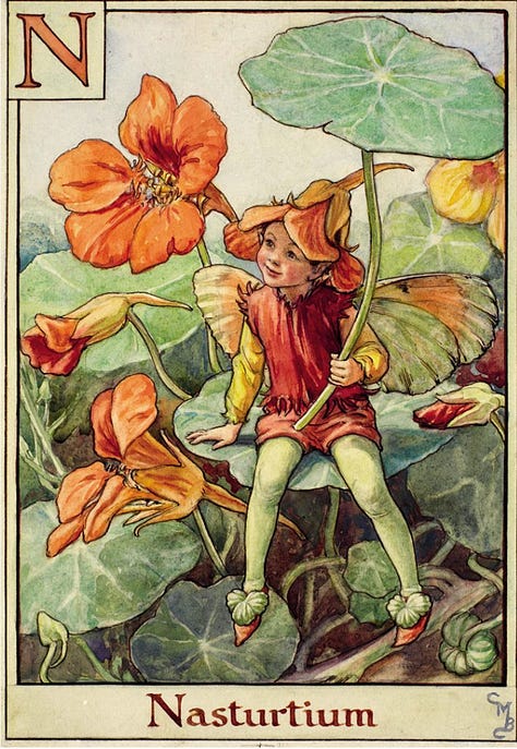 The Flower Fairies Alphabet (1934) by Cicely Mary Barker — “Nasturtium the Jolly” poem & illustration